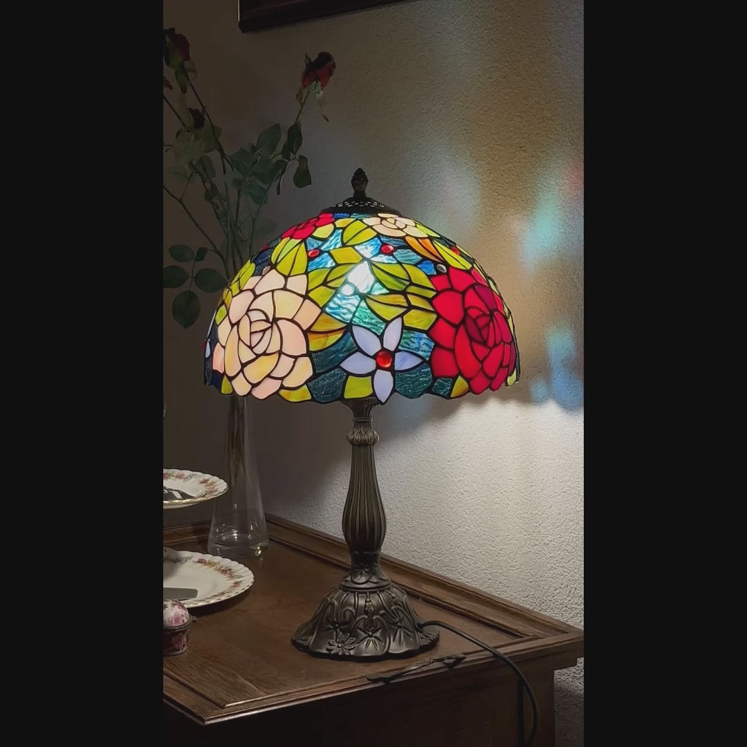 La lampe Tiffany Rosetta est une lampe de table faite à la main, réalisée selon la technique officielle du ruban de cuivre Tiffany. L'abat-jour se compose de teintes chaudes de rose, crème et vert, disposées avec soin pour former un ensemble floral. Dès que vous allumez la lumière, les roses s'illuminent d'une douce lueur dorée. Rosetta est ainsi une lampe en vitrail qui apporte élégance et chaleur. Grâce à son format plus grand, elle allie la grandeur d'une lampe Art déco au charme intemporel d'une lampe vintage.