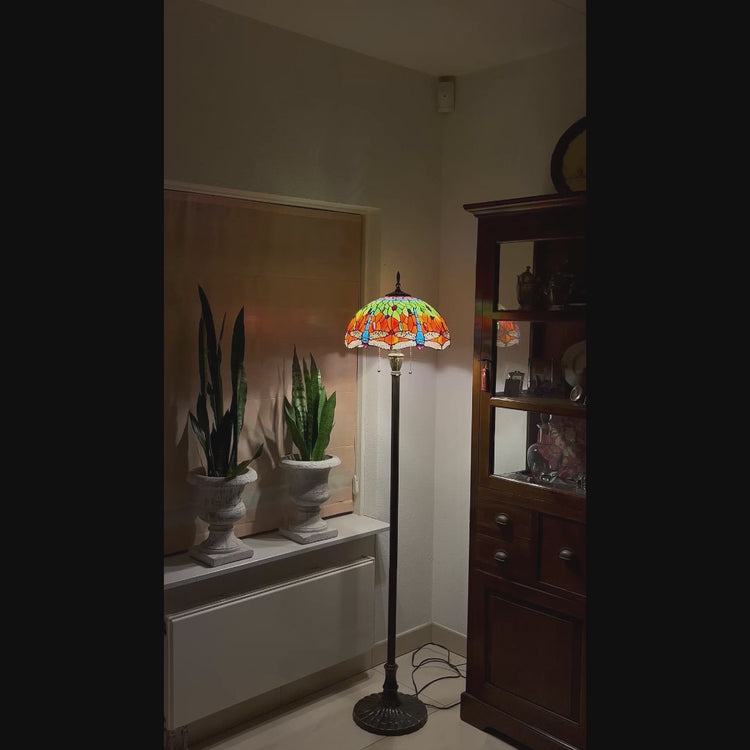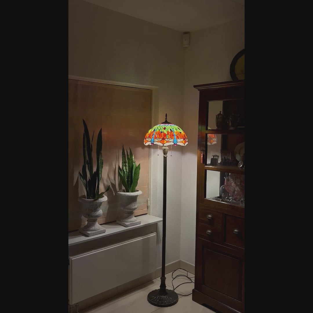 La lampe Tiffany Libellula Azul est une lampe sur pied faite à la main, réalisée selon la technique officielle du sertissage au ruban de cuivre de Tiffany. L'abat-jour est composé de tons chauds d'ambre, d'orange et de vert profond, dans lesquels des libellules bleu profond scintillent dès l'allumage. Cela fait de la lampe un envoûtant vitrail qui crée chaque soir un spectacle unique. Avec sa hauteur imposante et son pied en bronze foncé, la Libellula Azul dégage une élégance raffinée qui s'harmonise magnifiquement avec le charme intemporel d'une lampe vintage.