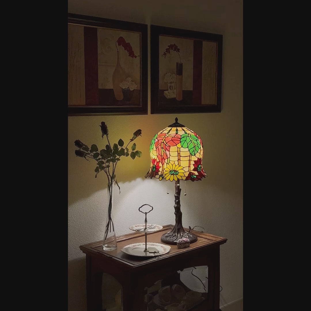 La lampe Tiffany Luminosa est une lampe de table artisanale, réalisée selon la technique officielle du ruban de cuivre Tiffany. L'abat-jour rond présente un motif ludique de feuilles d'automne en rouge et vert, associé à des fleurs d'un jaune vif. Cela fait de la Luminosa une véritable lampe en verre plombé qui apporte chaleur et couleur à la maison. Par sa forme élégante et sa base en forme de tronc, cette lampe dégage le charme d'une lampe vintage.
